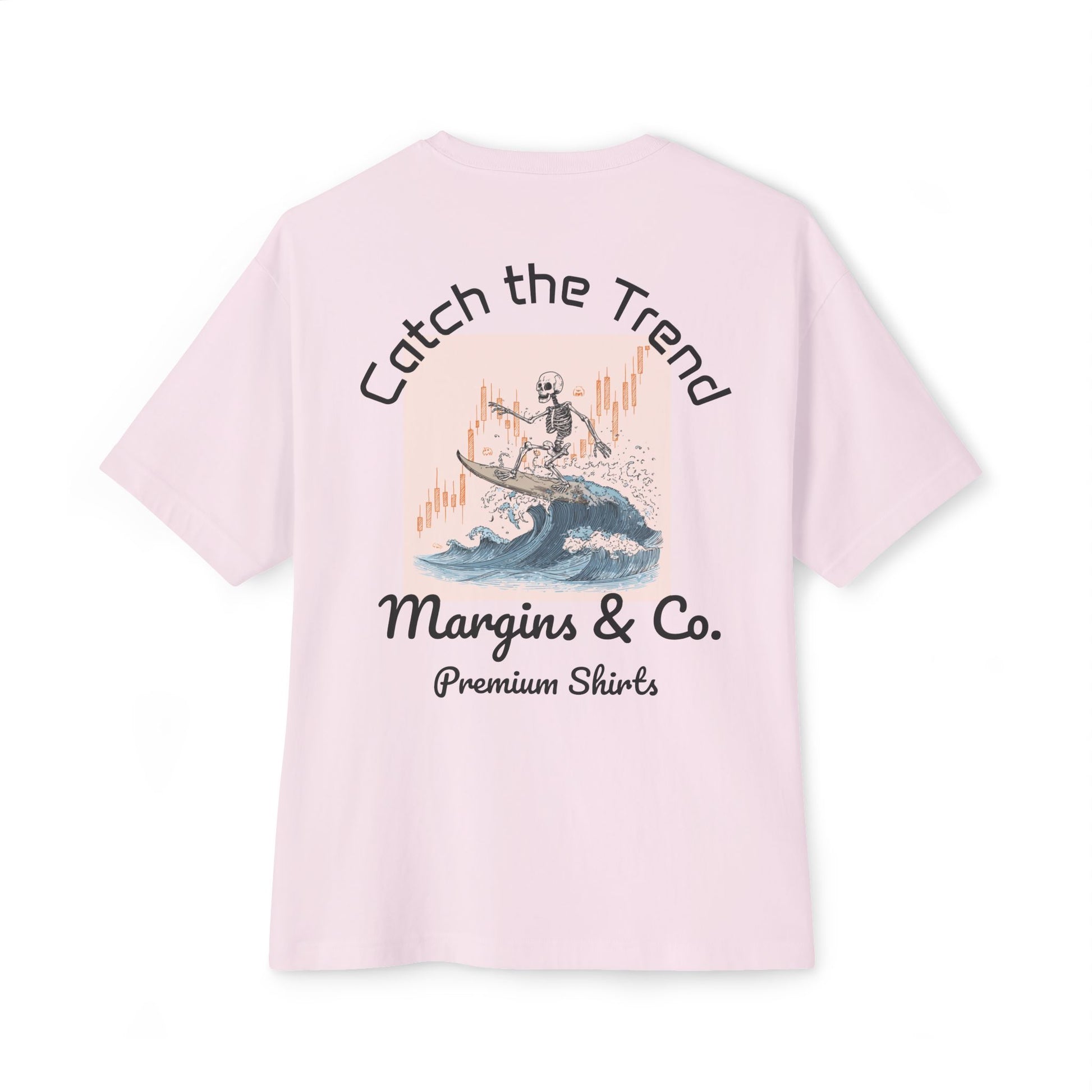 Markets move like waves — timing separates the winners from the wrecks. The Catch the Trend tee captures that energy: a hand-drawn skeleton surfing candlestick waves, with the mantra Catch the Trend riding above it all.
