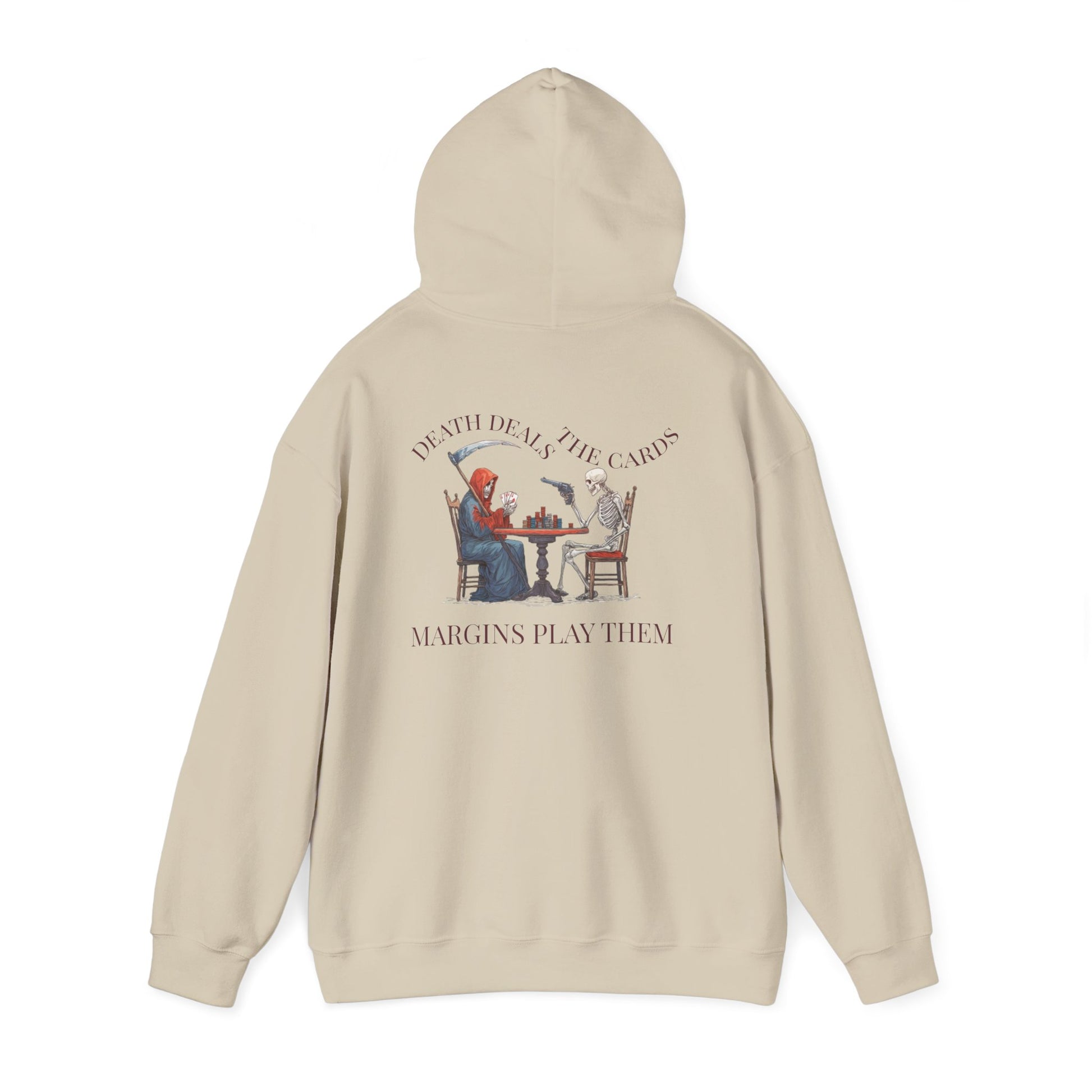 Step into the high-stakes world where risk meets reward. The “Death Deals the Cards, Margins Play Them” hoodie embodies the spirit of calculated risk-taking and unwavering confidence. Featuring a striking back graphic of Death at the card table, this design channels classic Western grit with a modern edge — a reminder that while fate may deal the hand, it’s in the margins where the true game is won.